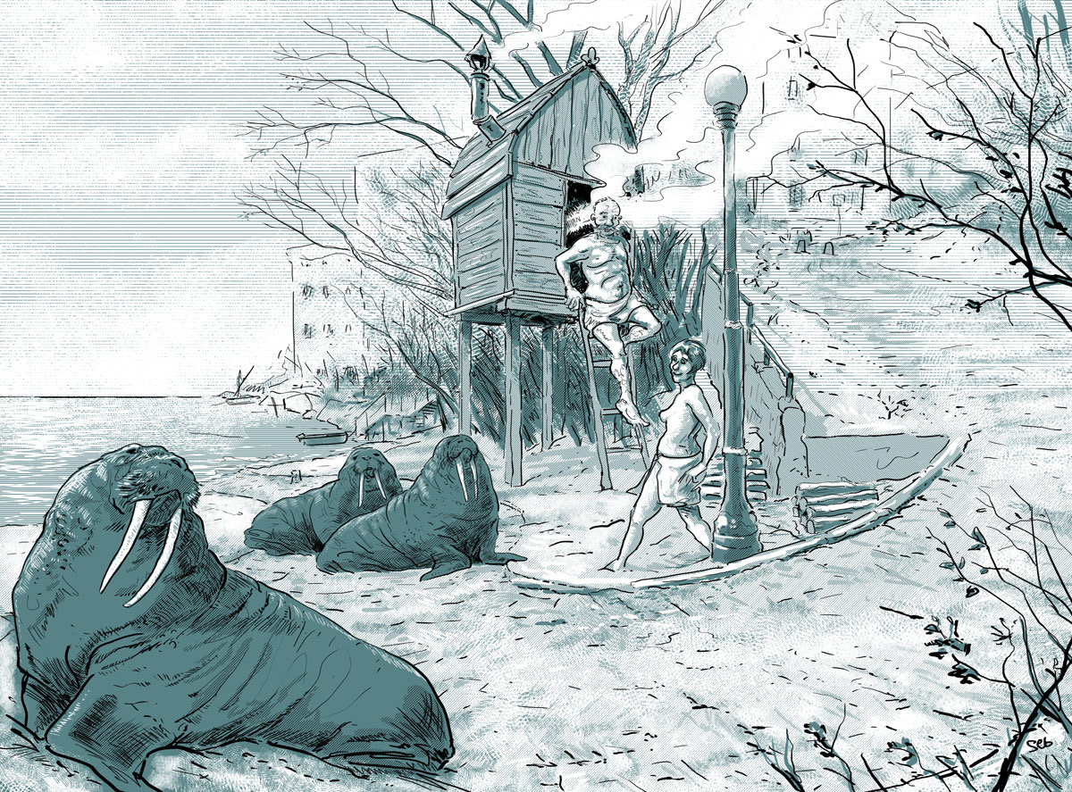En gelant, la mer immobilise les maisons flottantes et agrandit l’île de Saint-Jambe ; la banquise, devenue un pont de glace pour les amitiés saisonnières, ouvre une plage de calme où les sons s’étouffent dans l’hiver.