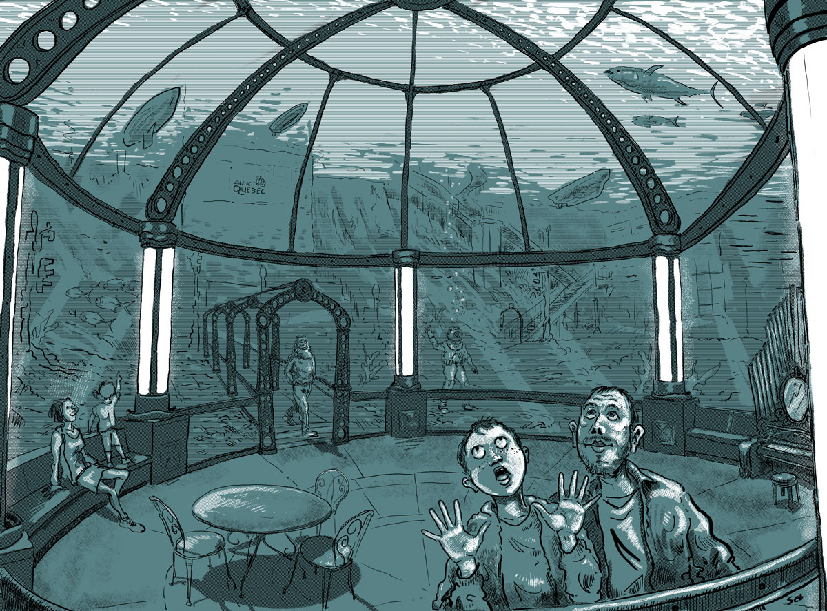 Lors des grandes marées, nous plongeons au cœur de la Basse-Ville engloutie en quête de nos propres profondeurs, célébrant ainsi les aventureux fondateurs de la boutique d’hommes-grenouilles qui étaient prêts depuis longtemps pour l’insularisation de Saint-Jambe.